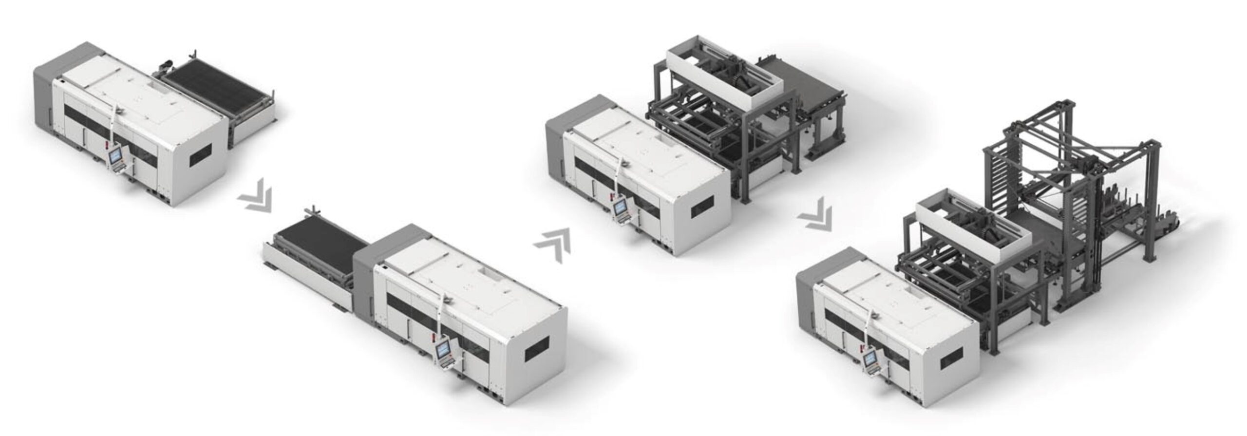 Láser chapa fibra, formato 3.000×1.500mm, potencia fuente de hasta 12 kW. Configuraciones de carga de chapa con diferentes opciones de automatización.